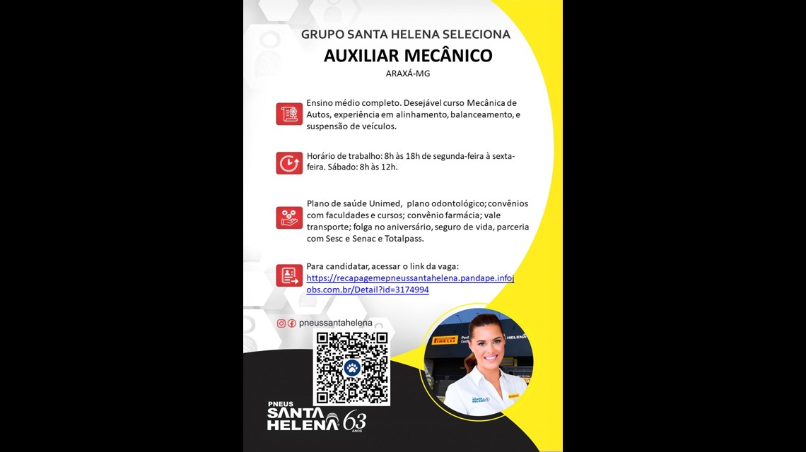 Somos o Grupo de Recapagem e Pneus Santa Helena que atua na vendas de pneus Pirelli, há 63 anos. Estamos em busca de um profissional Auxiliar de Mecânico para auxiliar em atividades de alinhamento, balanceamento, montagem e demontagem de pneus em veículo passeio.